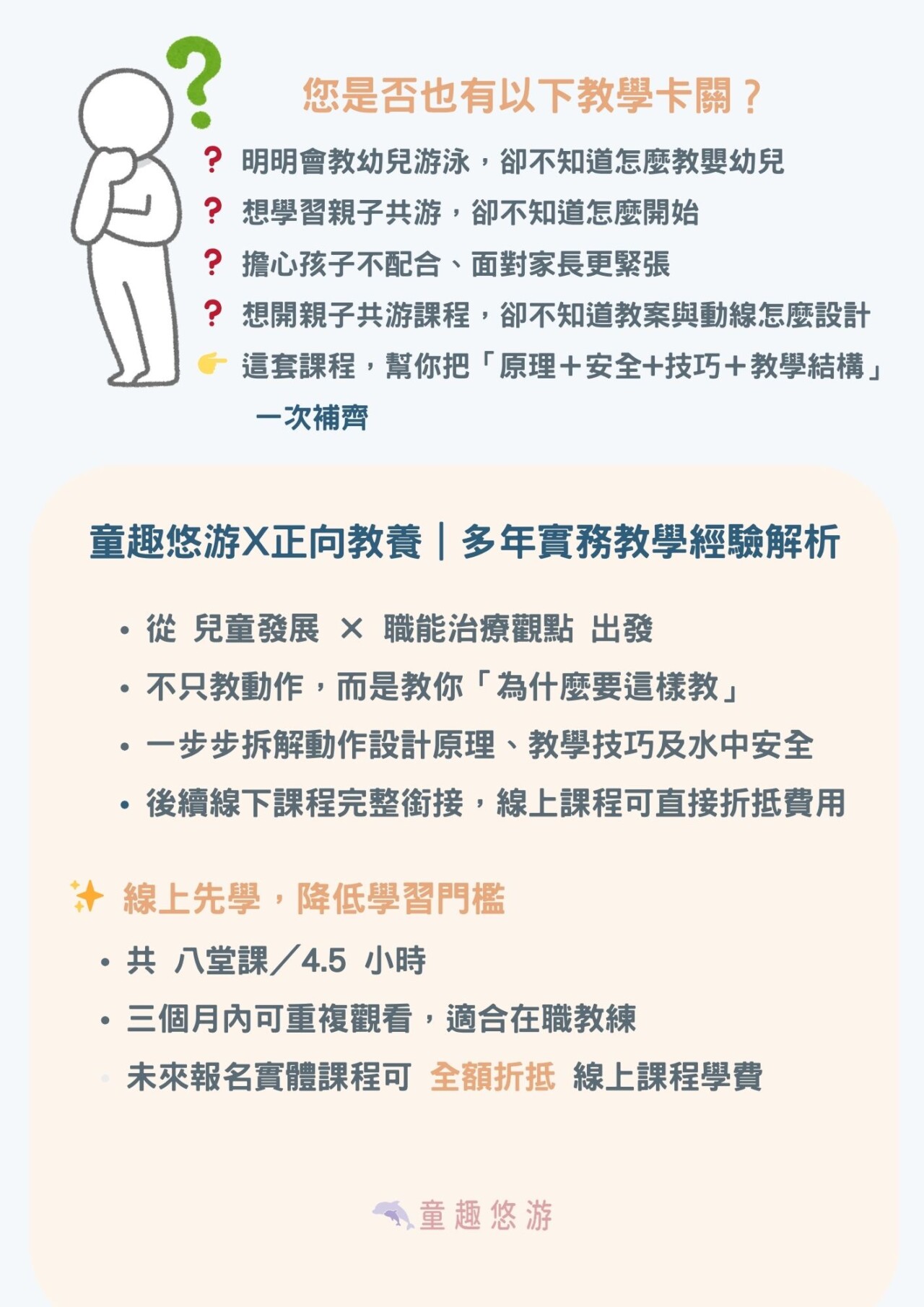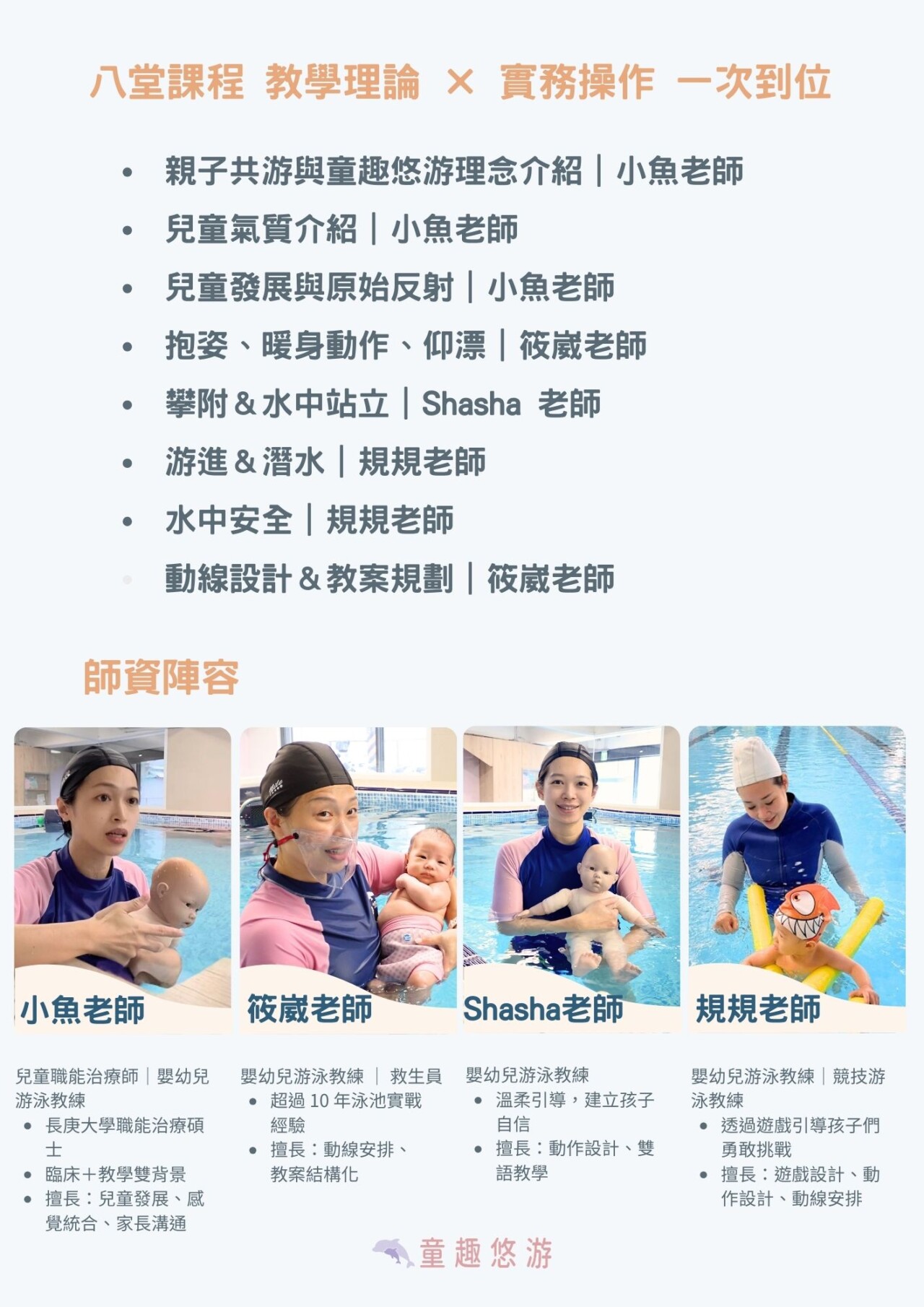 從兒童發展與心理發展出發,結合傳統游泳教學,童趣悠游師資群包含: