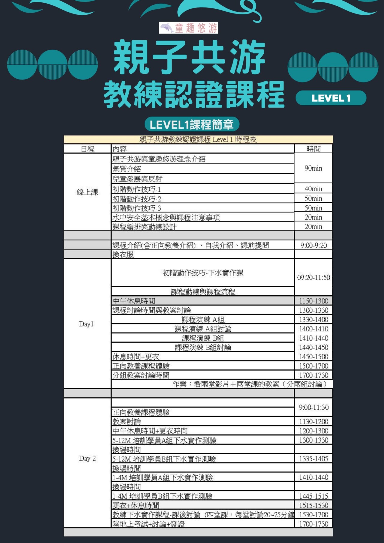 - 初階課程主旨在推廣親子共游活動並培養親子共游教練基礎帶課技巧。課程內容包含理念介紹、水中安全、課程編排與動線、動作技巧引導與下水實作測驗。課程簡章如下頁